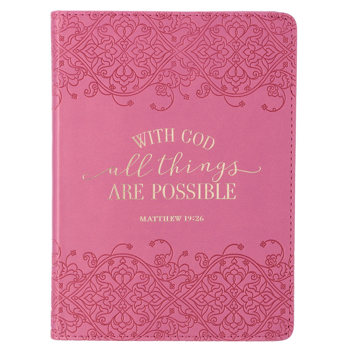 This unmistakably feminine journal is a perfect gift for any woman in your life. Make your daughter’s birthday extra special or send a sincere gift of appreciation to a friend or Bible study leader with the beautiful With God All Things Are Possible Pink Handy-Sized Faux Leather Journal.